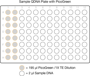 | 2. | Transfer 195 µl PicoGreen/1X TE dilution from the Standard DNA plate to columns 1 and 2 of the Standard QDNA plate. |