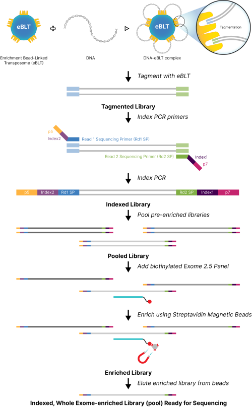 The IDPE Exome 2.5 workflow uses a bead-based transposome complex to tagment genomic DNA. Tagmentation is a process that fragments DNA and then tags the DNA with adapter sequences in one step. After it is saturated with input DNA, the bead-based transposome complex fragments a set number of DNA molecules. This fragmentation provides flexibility to use a wide DNA input range to generate normalized pre-enrichment libraries of consistent tight fragment size distribution.