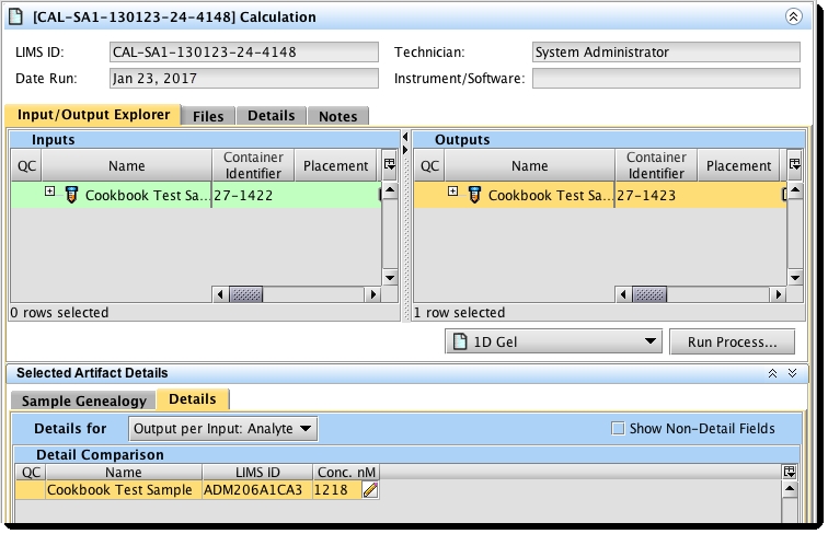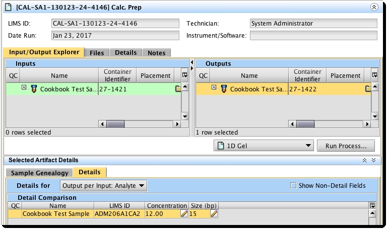 First, the values to be used in the calculation - the Concentration and Size (bp) UDFs / custom fields are applied to the samples by running the Calc. Prep preparation step. You can then enter the values for these fields into the LIMS as follows: