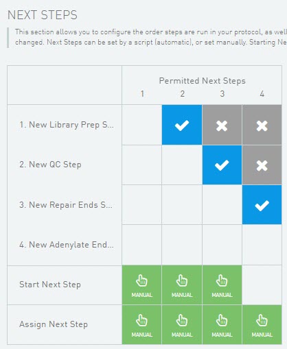 When configuring non-QC protocols, the protocol configuration form includes a Next Steps table. This allows you to configure the sequence in which steps are run in the protocol. This table does not display for QC protocols, because the steps in a QC protocol are typically not sequential.