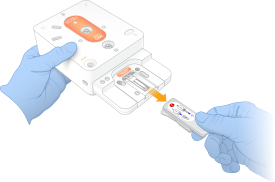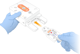 Um clique audível indica que a lâmina de fluxo está no lugar. Com o carregamento correto, a aba cinza se projeta para fora do cartucho.