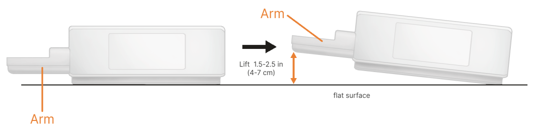 | 3. | [Química XLEAP-SBS] Coloque o cartucho em uma superfície plana. Levante o cartucho pelos braços aproximadamente 1,5 a 2,5 pol. (4 a 7 cm) acima da superfície plana, conforme mostrado, e solte na bancada cinco vezes. |