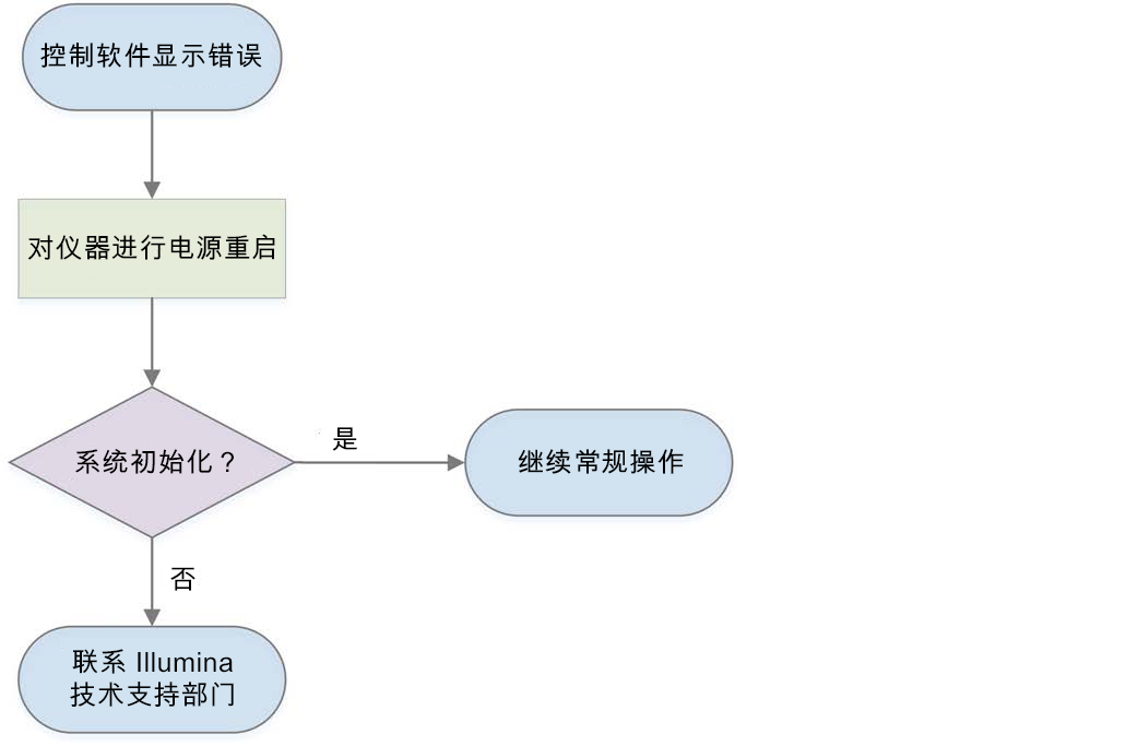 本附录提供各种故障诊断步骤的详细说明。下面的流程图概述了对错误消息进行故障诊断的过程,这些消息出现于初始化、运行设置或测序期间,并且无法通过重试予以解决。